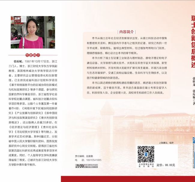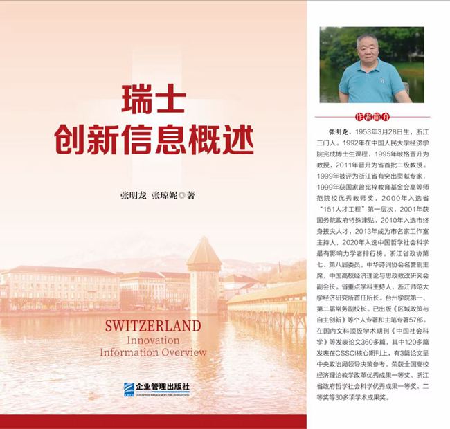 9月,企业管理出版社出版张明龙与张琼妮合著的《瑞士创新信息概述》。该书为16开本377页,38万字,责任编辑:赵喜勤;中国版本图书馆CIP数据核字(2023)第142537号。该书分析了瑞士在轻重工业制造与增材制造、微电子理论和电子通信设备、光学原理与激光技术、太阳系及其他宇宙天体探测、新型材料和纳米材料、开发利用太阳能并扩展可再生能源、环境污染治理与生态环境保护、交通工具和运输设施、生命科学与生物技术,以及医疗和健康领域的创新信息。